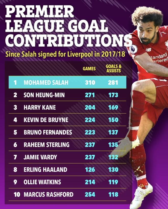 萨拉赫最恐怖的地方,不是他爆发过,而是他从未“冷”过。 从2017年空降安菲尔德开始,他在英超踢了310场,直接参与了281个进球。这是个什么概念?放眼同期的顶级射手,孙兴慜173球、凯恩169球、德布劳内150球。萨拉赫不是领先,他是把这帮同时代的巨星整整甩开了一个断层。很多人都有过“高光赛季”,但萨拉赫是从20多岁杀到30多岁,始终保持这种非人类的输出效率。
